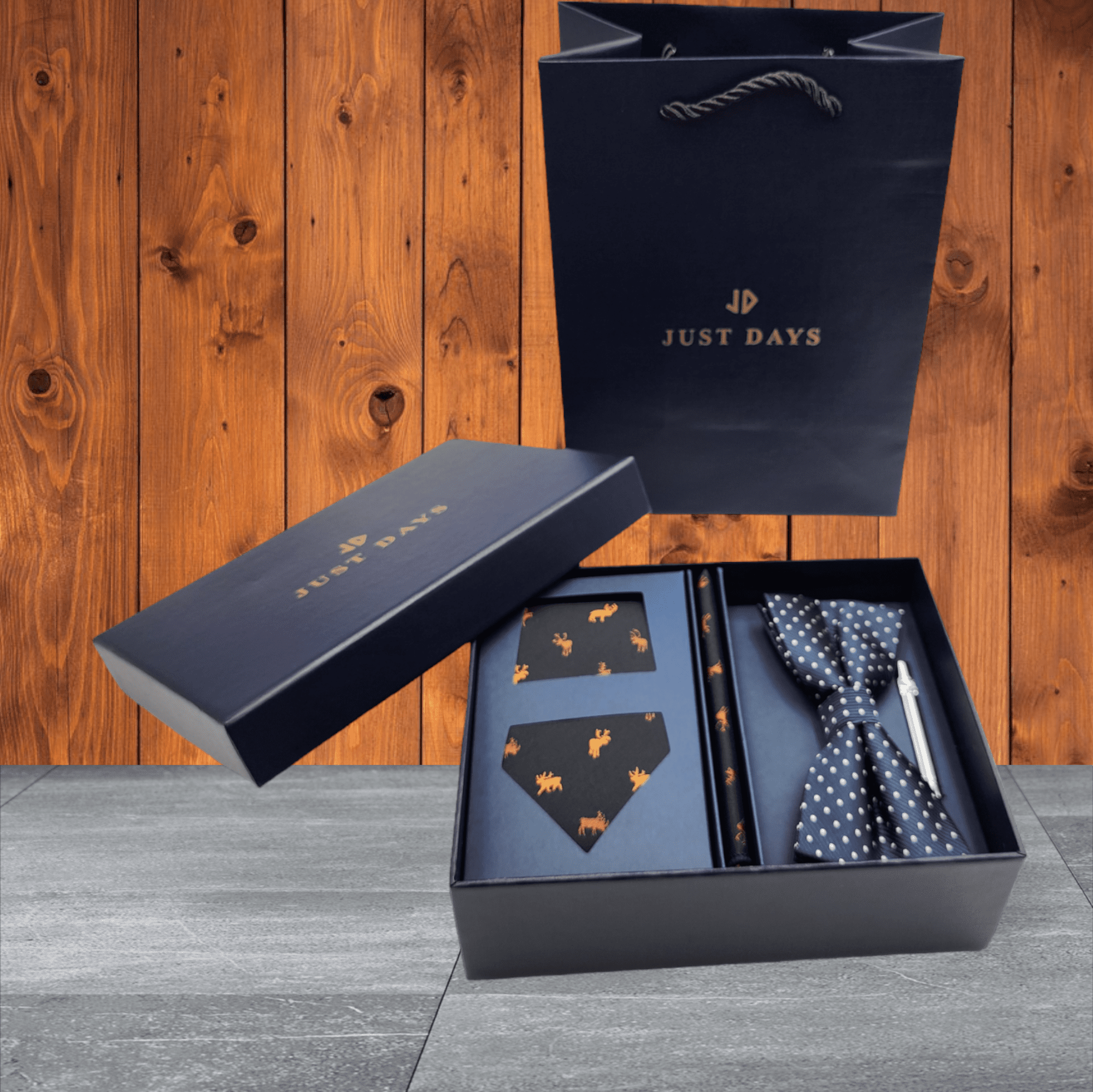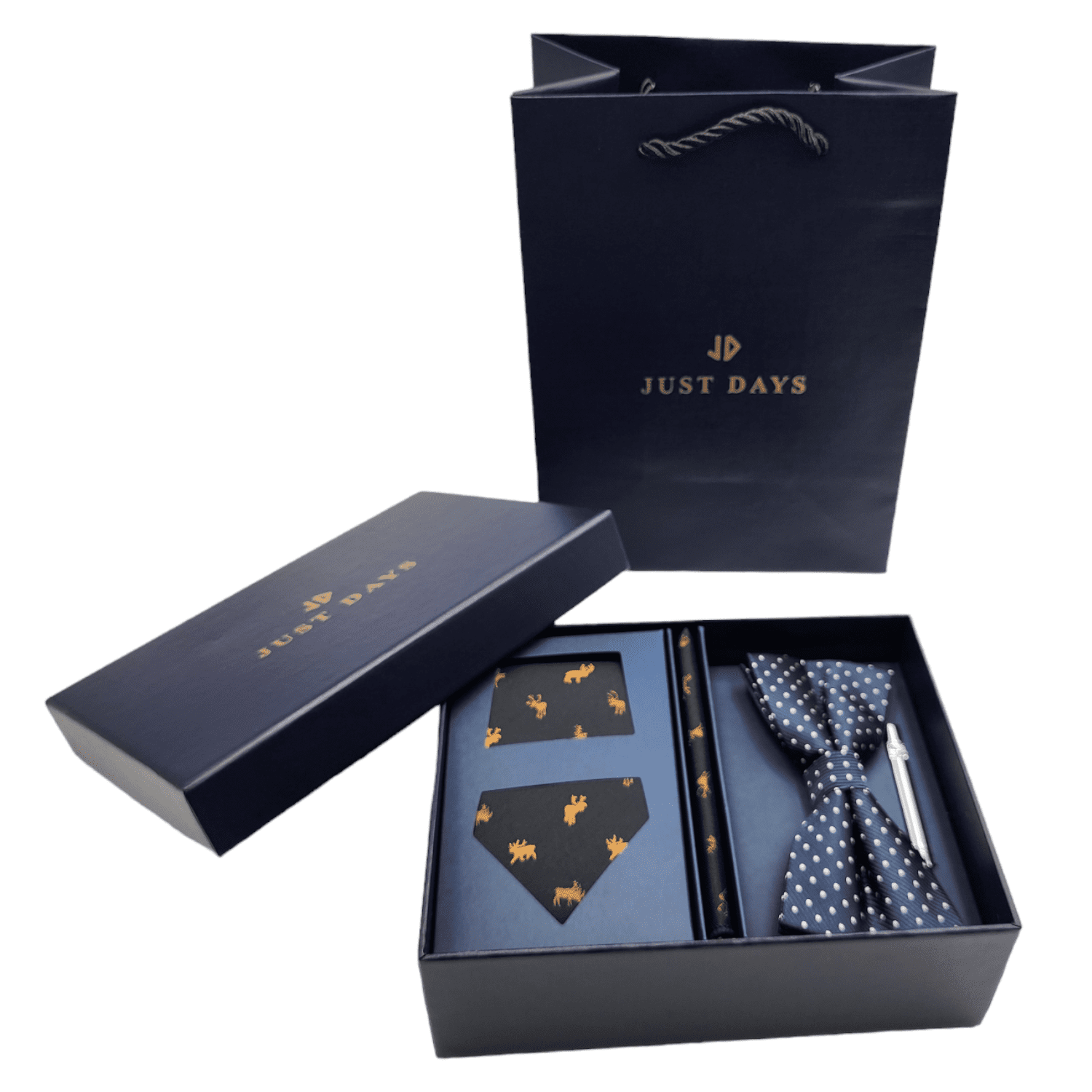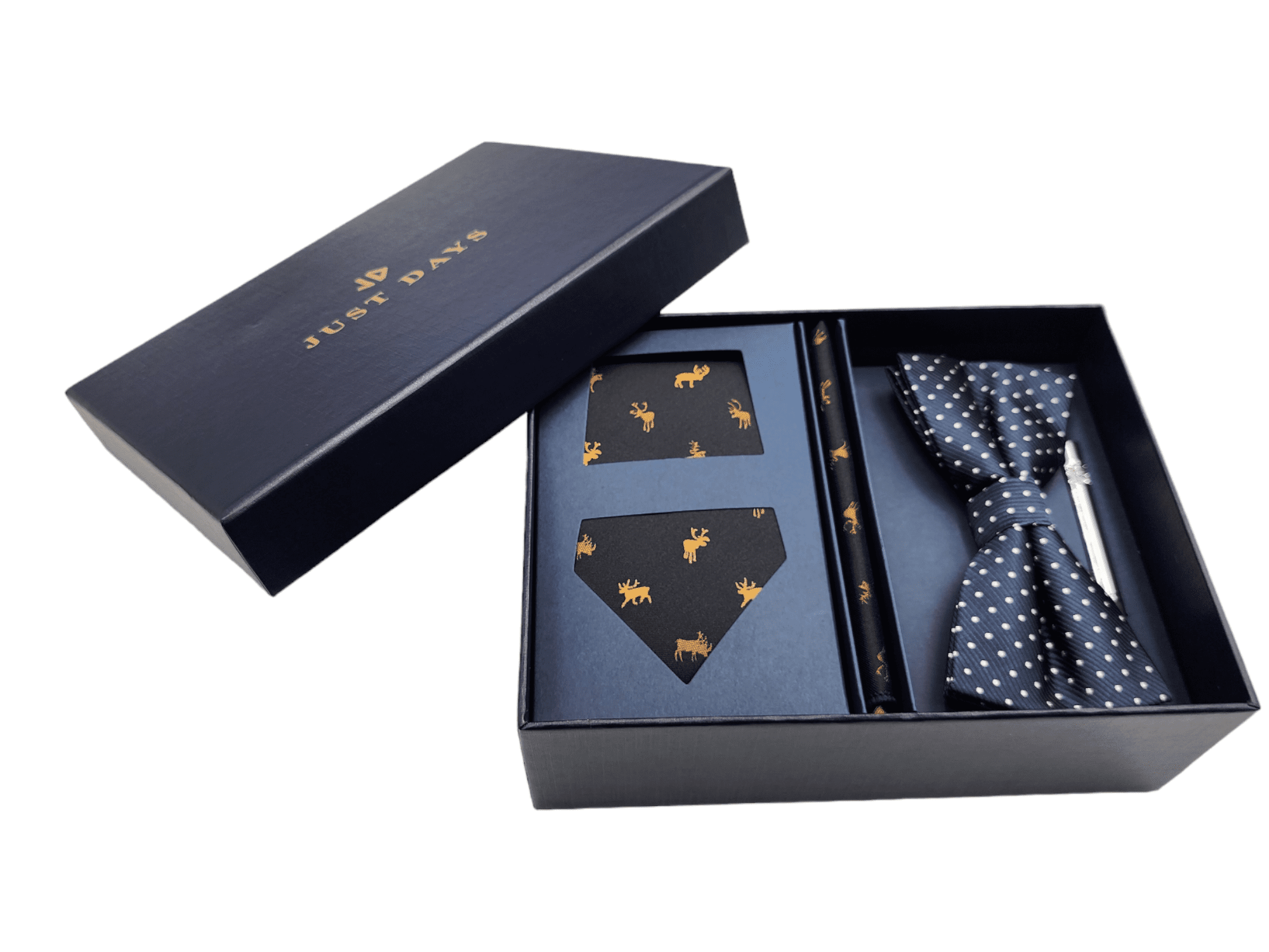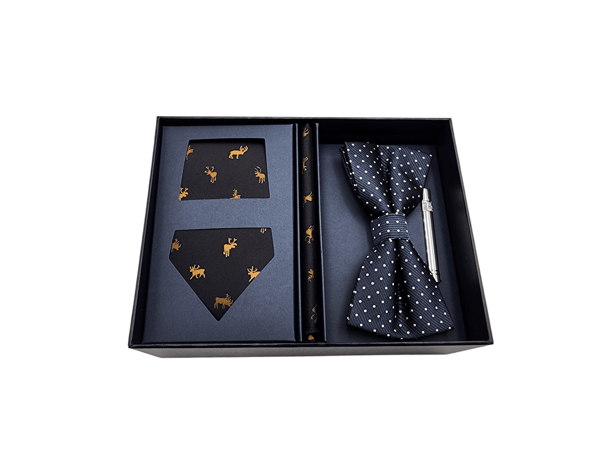 A necktie, Pocket square, Tie clip and bow tie are included in the gift box.